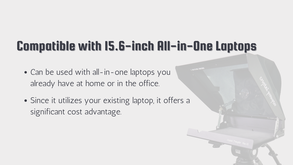 Flex 15 is a portable teleprompter designed to meet field demands for larger screen sizes. It allows users to utilize their existing all-in-one laptop, offering excellent cost efficiency for professionals on the move.